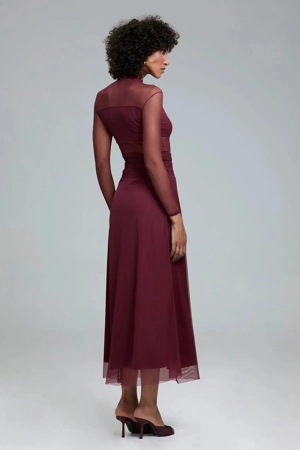 Blusa manga longa, confeccionada em tule. Gola alta. Forro embutido no busto.
