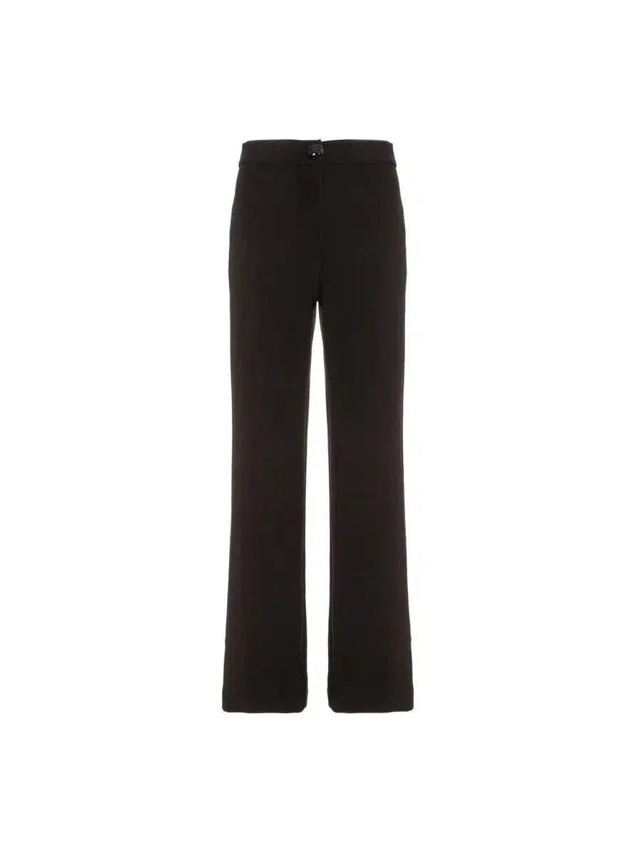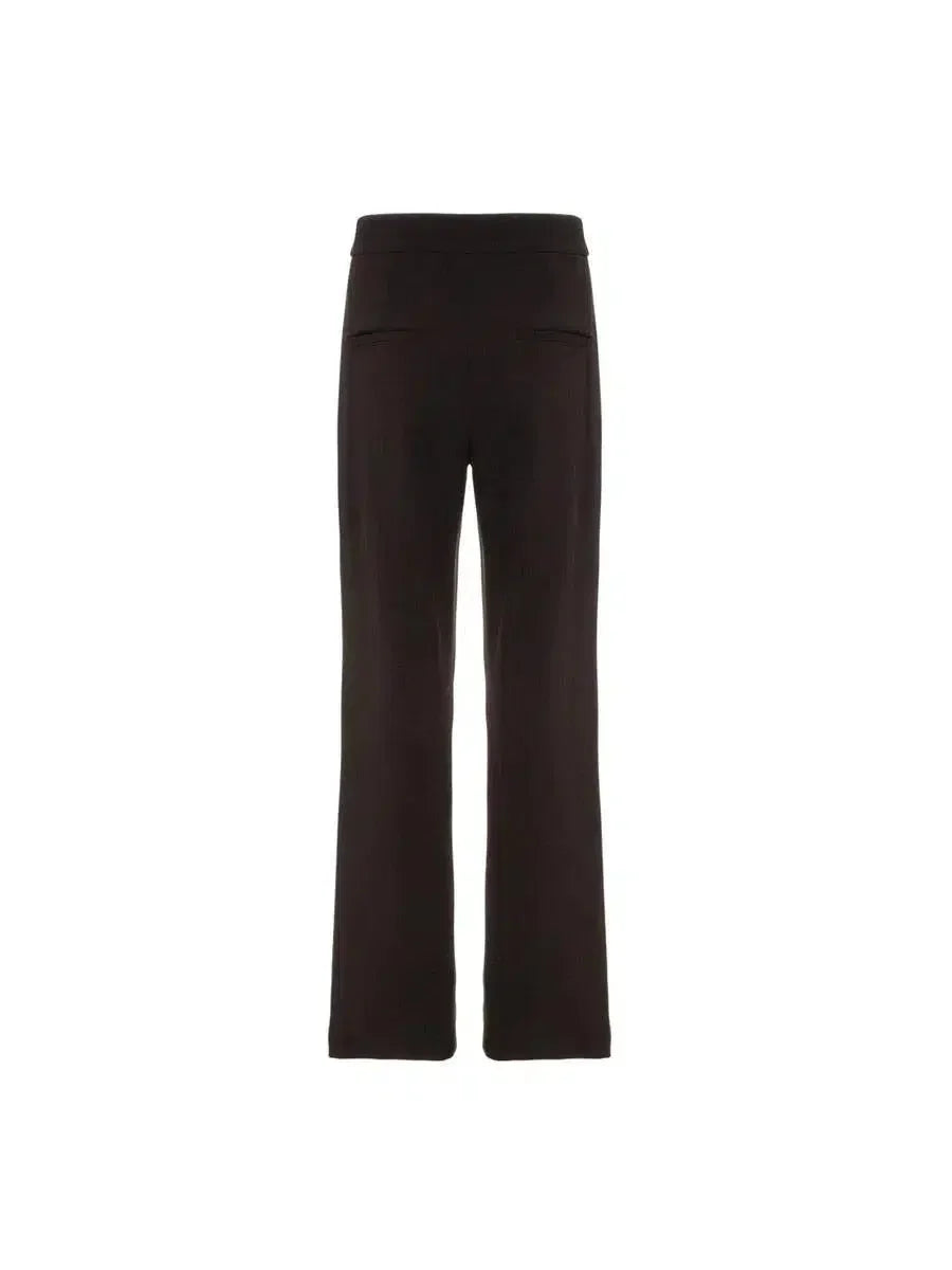 Calça reta, confeccionada em crepe de malha. Fechamento frontal por zíper e botão de resina personalizado. Bolso traseiro embutido.